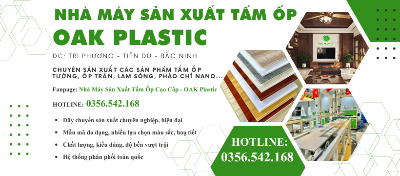 Giới thiệu chung về OAK Plastic Nhà máy sản xuất OAK plastic xứng tầm với danh hiệu đơn vị sản xuất và phân phối tấm ốp Nano, ốp tường ốp trần hàng đầu hiện nay, OAK plastic hiện đã hợp tác với hàng trăm đơn vị thi công và cửa hàng vật liệu xây đựng để phân phối sản phẩm. Chúng tôi tự hào là đơn vị sản xuất và phân phối toàn quốc sản phẩm tấm ốp Nano, với nhiều ưu điểm vượt trội như: Được sản xuất từ nhựa nguyên sinh cao cấp, đảm bảo 100% về độ dẻo và tính chịu lực rất cao. Không cong vênh, khôn…
